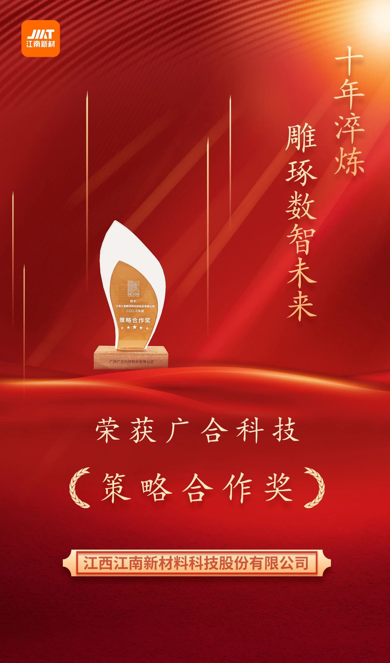 在廣合科技(001389)首次公開發(fā)行A股上市晚宴暨10周年慶典上,廣合科技授予江南新材“策略合作獎”,這份獎項(xiàng)是對江南新材與廣合科技長期穩(wěn)定合作關(guān)系的認(rèn)可,更是對未來合作發(fā)展的信任與期許!躬逢榮耀,與有榮焉!江南新材深深感恩并倍感珍惜在里程碑式的時(shí)刻收獲廣合科技授予的獎項(xiàng)!
