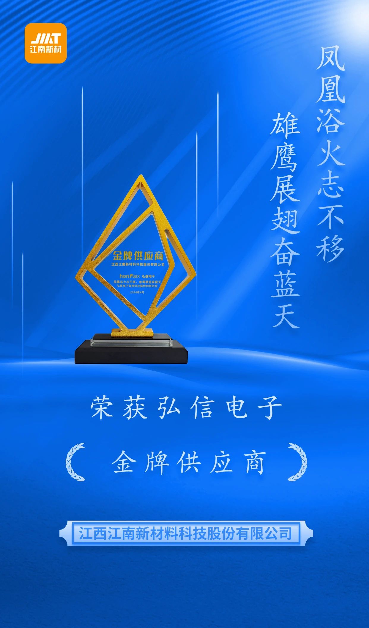 江南新材憑借卓越的品質(zhì)與合作表現(xiàn)榮獲了弘信電子授予"金牌供應(yīng)商"獎(jiǎng)項(xiàng)。 江南新材對(duì)弘信電子給予的每一份支持與機(jī)遇,都心存深深的感激與珍視!這份“熱火”,淬煉了江南新材的創(chuàng)新引擎,更點(diǎn)燃了我們追求卓越的激情與決心!