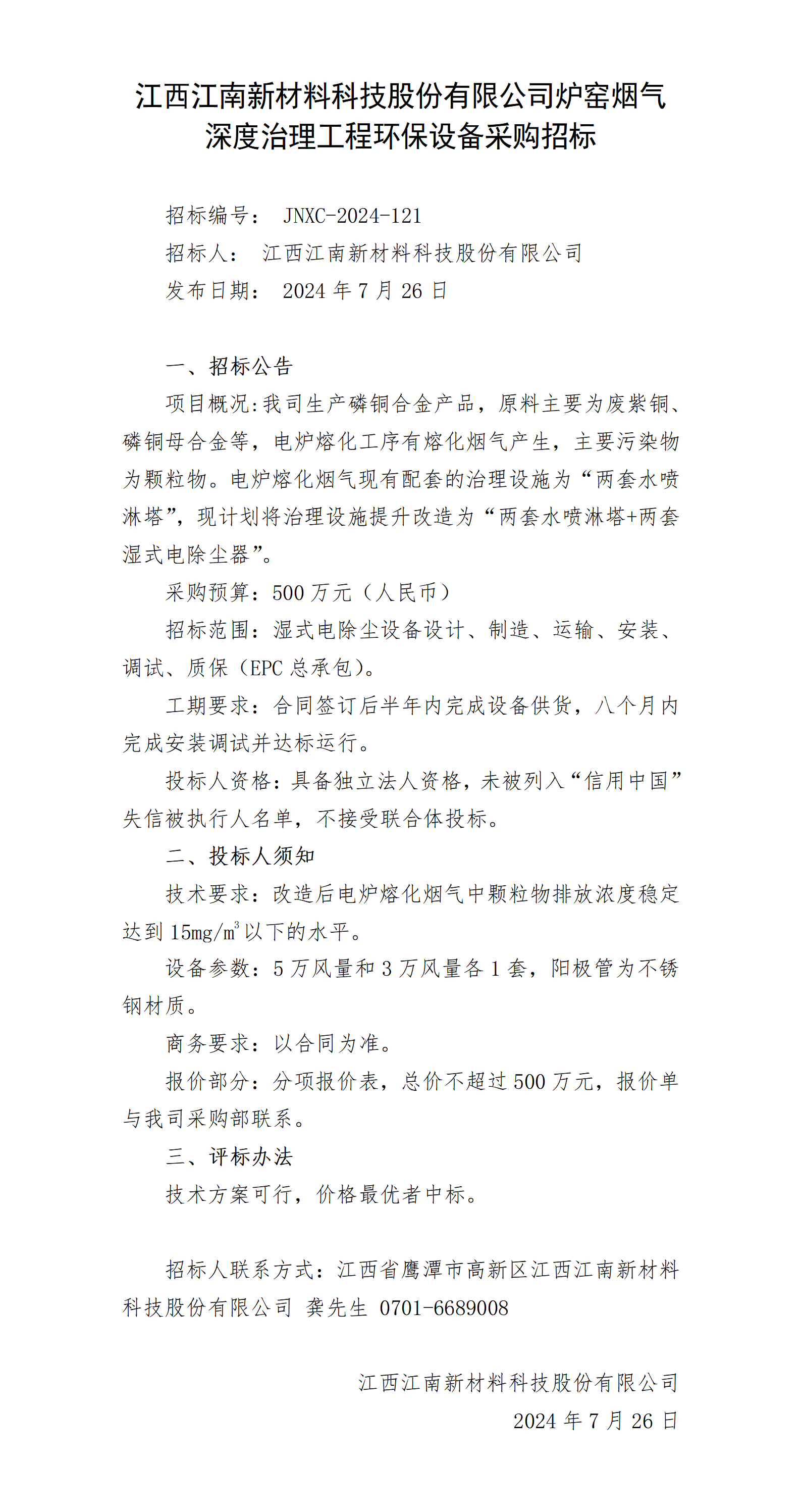 江西江南新材料科技股份有限公司爐窯煙氣深度治理工程環(huán)保設備采購招標