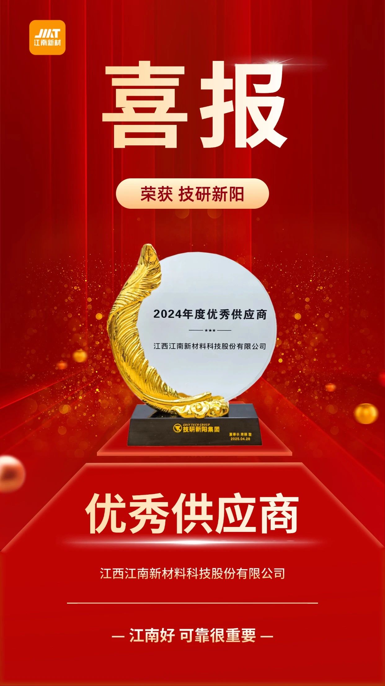 本次供應(yīng)商大會(huì),向16家合作伙伴頒發(fā)了貢獻(xiàn)獎(jiǎng)、納期獎(jiǎng)、品質(zhì)獎(jiǎng)和優(yōu)秀供應(yīng)商獎(jiǎng)。江南新材榮獲技研新陽(yáng)2024年度優(yōu)秀供應(yīng)商!